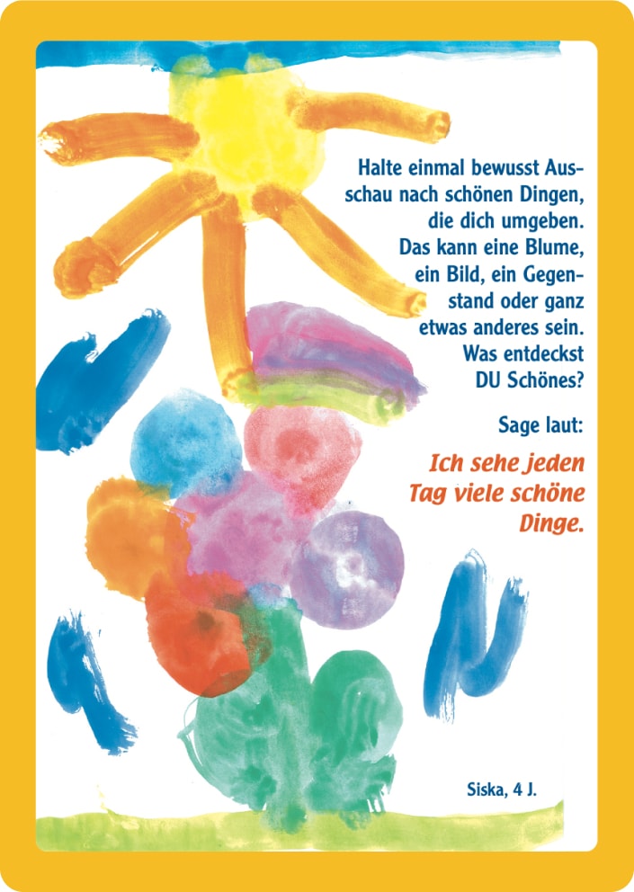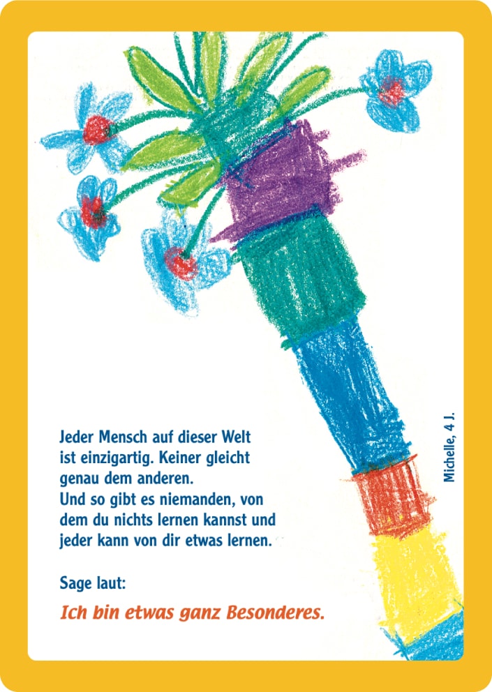 Viele Eltern möchten ihre Kinder ermutigen und ihnen helfen, zu starken Persönlichkeiten zu werden. „Aber wie?“ wurde ich immer wieder in meiner Praxis gefragt. Um die tägliche Ermutigungsarbeit von Eltern und anderen Erziehungsbeauftragten zu erleichtern, habe ich auf dem Hintergrund meiner individualpsychologischen Tätigkeit Ermutigungskarten für kleine und große Kinder entwickelt. Kurze ermutigende Texte wurden mit wunderschönen Kinderbildern in fröhlichen leuchtenden Farben kombiniert.